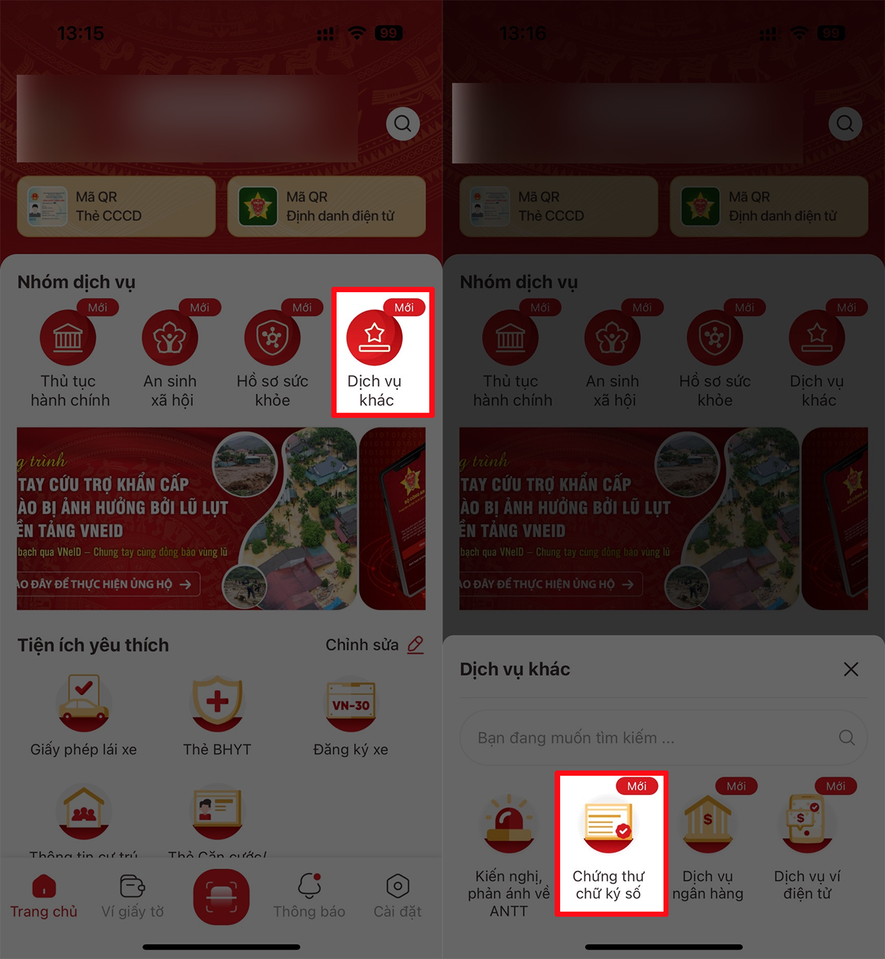 Bước 1: Mở ứng dụng VNeID trên điện thoại của bạn lên > Nhấn chọn vào mục Dịch vụ khác > Chọn tiếp vào mục Chứng thư chữ ký số.