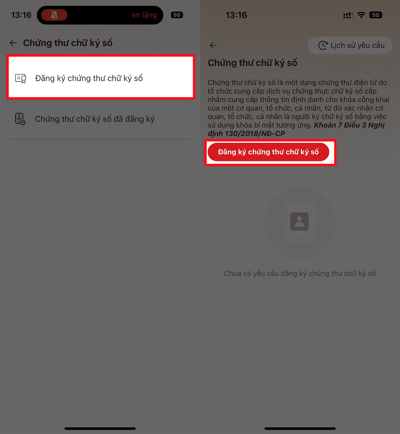 Bước 2: Chọn tiếp vài mục Đăng ký chứng thư chữ ký số > Đọc để hiểu rõ và chọn lại lần nữa vào mục Đăng ký chứng thư chữ ký số.