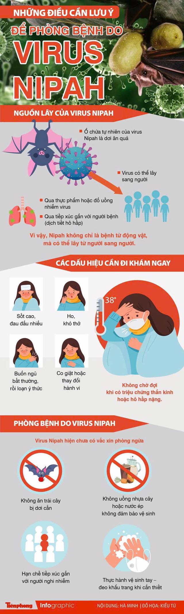 Nipah là virus lây truyền từ động vật sang người, chủ yếu qua tiếp xúc trực tiếp với động vật nhiễm bệnh, thực phẩm bị ô nhiễm hoặc lây từ người sang người qua tiếp xúc trực tiếp dịch tiết và qua đường hô hấp. Thời gian ủ bệnh của NiV (tính từ khi phơi nhiễm đến khi xuất hiện triệu chứng) thường dao động 4 - 14 ngày, tuy nhiên đã ghi nhận một số trường hợp hiếm có thời gian ủ bệnh kéo dài tới 45 ngày. Khi phát bệnh, người nhiễm Nipah thường có biểu hiện ốm trong khoảng 3 - 14 ngày. Sau đó, bệnh có thể diễn tiến nhanh sang viêm não, gây rối loạn ý thức và trong những trường hợp nặng, bệnh nhân có thể rơi vào hôn mê chỉ trong vòng 24 - 48 giờ, đe dọa trực tiếp đến tính mạng.Tại Việt Nam, bệnh do Nipah virus gây ra được xếp vào bệnh truyền nhiễm nhóm A - là các bệnh đặc biệt nguy hiểm và tỷ lệ tử vong cao nhưng chưa ghi nhận ca mắc. Để chủ động phòng chống dịch bệnh do Virus Nipah gây ra, Bộ Y tế khuyến cáo người dân thực hiện tốt các biện pháp sau:Hạn chế đến khu vực có dịch bệnh do virus Nipah nếu không thực sự cần thiết.Tự theo dõi sức khỏe, trong vòng 14 ngày kể từ khi về từ vùng dịch, nếu có các triệu chứng như: đau đầu, đau cơ, nôn mửa và đau họng, chóng mặt, buồn ngủ, lú lẫn, co giật cần liên hệ ngay với cơ sở y tế gần nhất, hạn chế tiếp xúc với người khác, thông báo rõ tiền sử dịch tễ cho nhân viên y tế.Đảm bảo vệ sinh thực phẩm: thực hiện "Ăn chín, uống sôi", rửa sạch và gọt vỏ trái cây trước khi ăn, không ăn, uống các loại trái cây có dấu hiệu bị động vật (dơi, chim) cắn hoặc gặm nhấm; tránh uống nước nhựa cây (như nhựa cây thốt nốt, nhựa dừa sống hoặc chưa qua chế biến).Không tiếp xúc gần với động vật có khả năng lây truyền cao như dơi ăn quả; thường xuyên rửa tay bằng xà phòng hoặc dung dịch sát khuẩn sau khi giết mổ, tiếp xúc với động vật.Hạn chế tiếp xúc trực tiếp với người bệnh, vật phẩm ô nhiễm từ người bệnh; cần sử dụng khẩu trang, găng tay và đồ bảo hộ cá nhân khi chăm sóc, điều trị người nghi ngờ, mắc bệnh, sau đó rửa tay bằng xà phòng hoặc dung dịch sát khuẩn.Virus Nipah là bệnh truyền nhiễm nguy hiểm với tỷ lệ tử vong cao và hiện chưa có thuốc điều trị hay vắc xin đặc hiệu. Vì vậy, chủ động phòng ngừa, nhận biết sớm triệu chứng và tuân thủ khuyến cáo y tế là biện pháp quan trọng nhất để bảo vệ sức khỏe bản thân và cộng đồng, đồng thời góp phần hạn chế nguy cơ bùng phát và lây lan dịch bệnh.